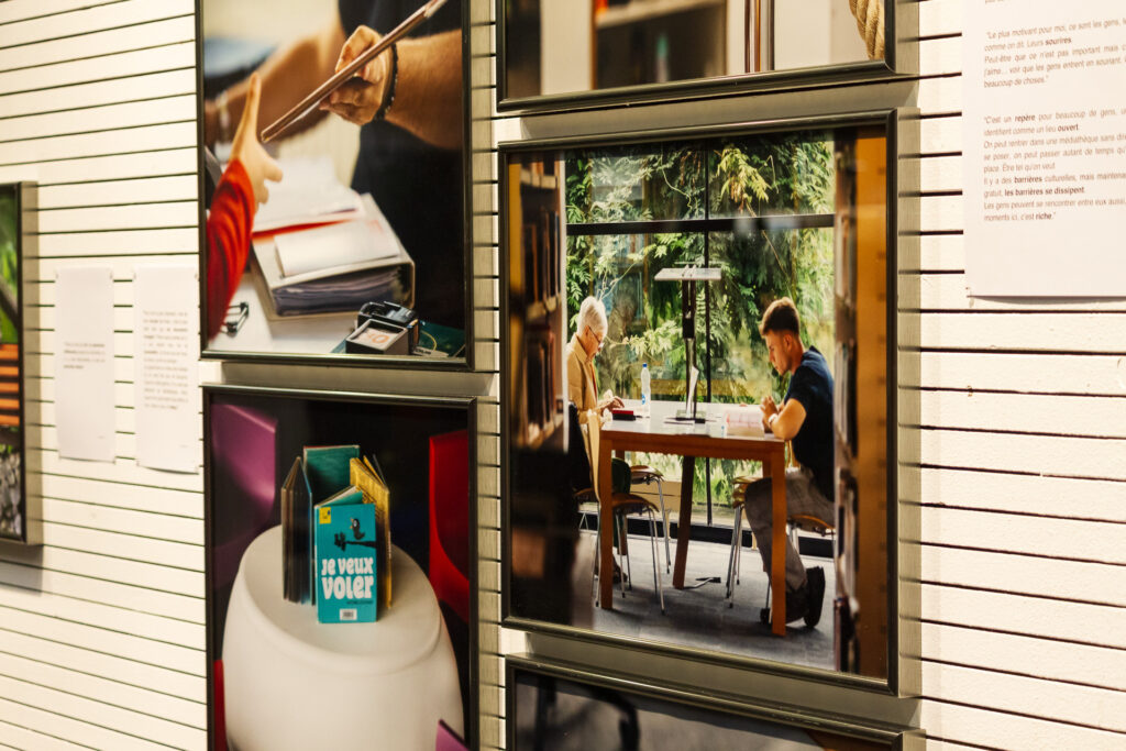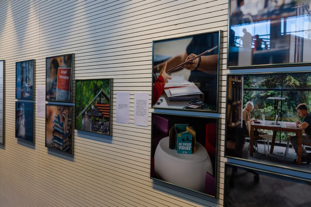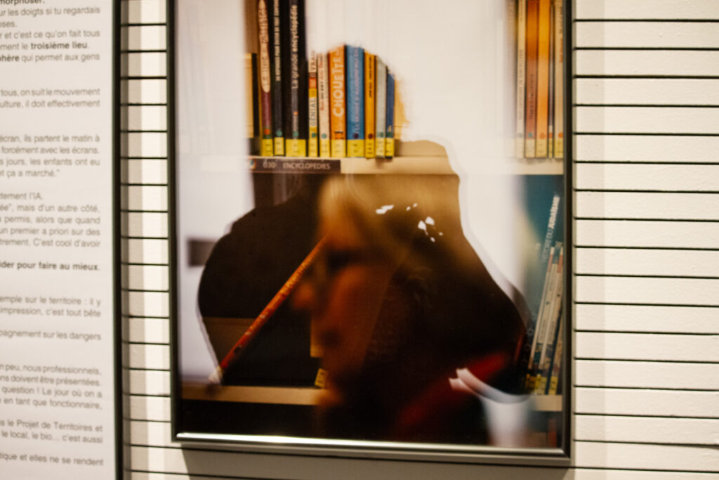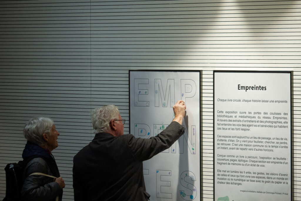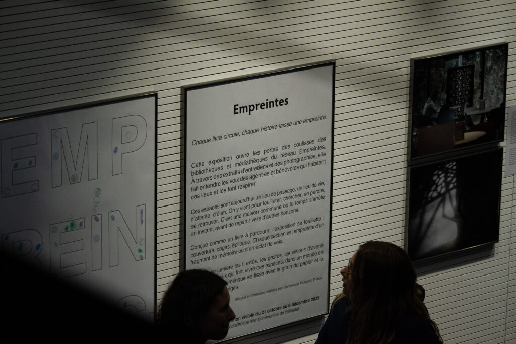 "Cette exposition ouvre les portes des coulisses des bibliothèques et médiathèques du réseau Empreintes. À travers des extraits d’entretiens et des photographies, cette exposition fait entendre les voix des agent·es et bénévoles qui habitent ces lieux et les font respirer. Ces espaces sont aujourd’hui un lieu de passage, un lieu de vie, d’attente, d’élan. On y vient pour feuilleter, chercher, se perdre, se retrouver. C’est une maison commune où le temps s’arrête un instant, avant de repartir vers d’autres horizons. Conçue comme un livre à parcourir, l’exposition se feuillette : couverture, pages, épilogue. Chaque section est empreinte d'un fragment de mémoire ou d'un éclat de voix. Elle met en lumière les fiertés, les gestes, les visions d’avenir de celles et ceux qui font vivre ces espaces, dans un monde en mutation où le numérique se tisse avec le grain du papier et la chaleur des échanges."