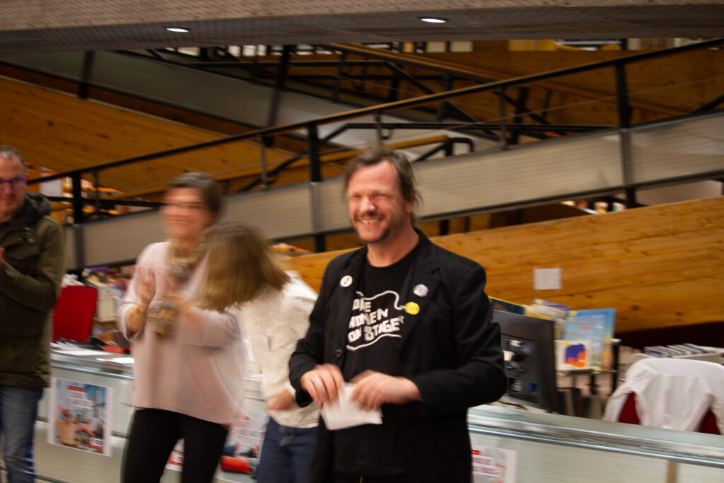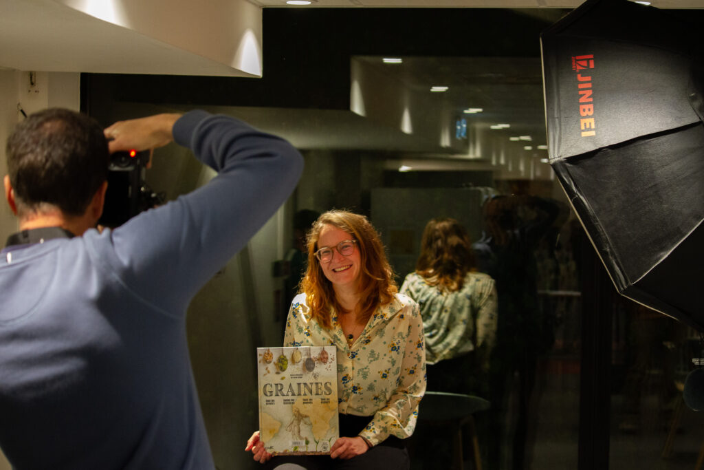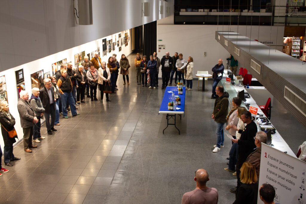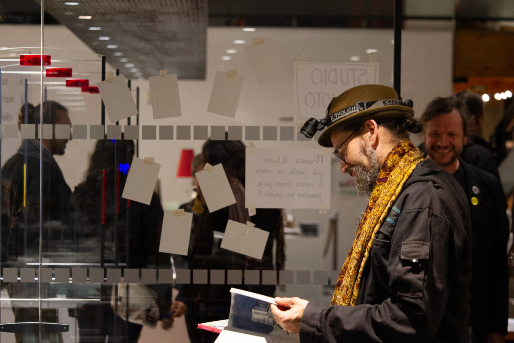 Vendredi 24 octobre avait lieu le vernissage en présence de l’artiste. L’association Résigraphies était présente pour couvrir l’événement en images et pour proposer un studio photo aux visiteurs. Chaque personne était invitée à chercher dans la bibliothèque un ouvrage qui lui corresponde, la représente, la touche puis à venir s’installer sous les projecteurs du studio !