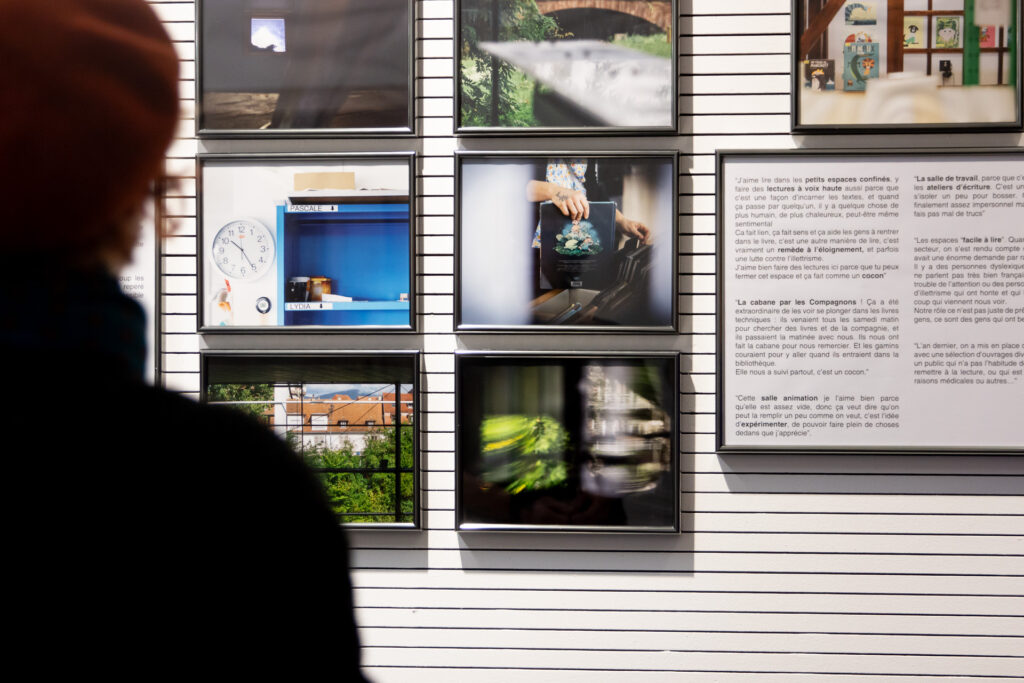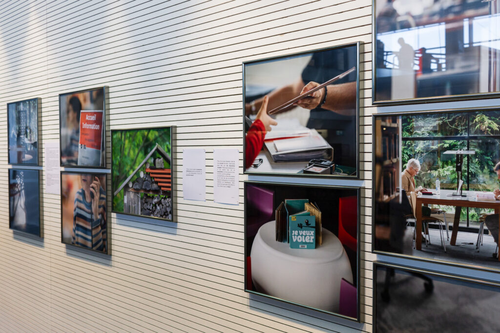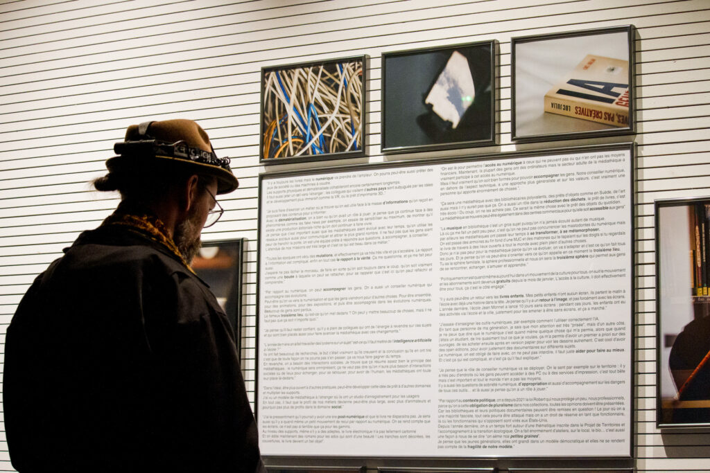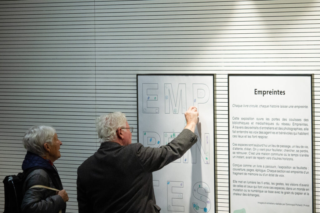 "Cette exposition ouvre les portes des coulisses des bibliothèques et médiathèques du réseau Empreintes. À travers des extraits d’entretiens et des photographies, cette exposition fait entendre les voix des agent·es et bénévoles qui habitent ces lieux et les font respirer. Ces espaces sont aujourd’hui un lieu de passage, un lieu de vie, d’attente, d’élan. On y vient pour feuilleter, chercher, se perdre, se retrouver. C’est une maison commune où le temps s’arrête un instant, avant de repartir vers d’autres horizons. Conçue comme un livre à parcourir, l’exposition se feuillette : couverture, pages, épilogue. Chaque section est empreinte d'un fragment de mémoire ou d'un éclat de voix. Elle met en lumière les fiertés, les gestes, les visions d’avenir de celles et ceux qui font vivre ces espaces, dans un monde en mutation où le numérique se tisse avec le grain du papier et la chaleur des échanges."